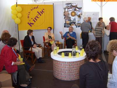 So voll war das große Zelt der KirchenVolksBewegung bei fast allen 22 "Gesprächen am Jakobsbrunnen". Hier am Samstagmorgen Frau Dr. Claudia Lücking-Michel (Vizepräsidentin des ZdK) zum Thema "Pastorales Zukunftsgespräch" mit Sigrid Grabmeier und Christian Weisner.